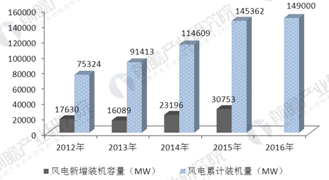 2012-2016年并網(wǎng)風(fēng)電裝機(jī)容量和每年新增量(單位:MW,MW)