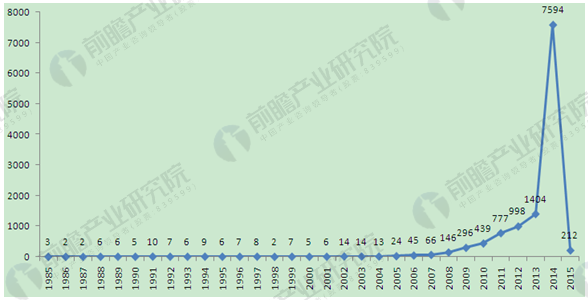 1985-2015年中國風(fēng)電行業(yè)專利申請數(shù)量(單位:件)