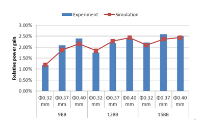 圖一: 多主柵組件的實(shí)驗(yàn)功率增益和理論模擬功率增益