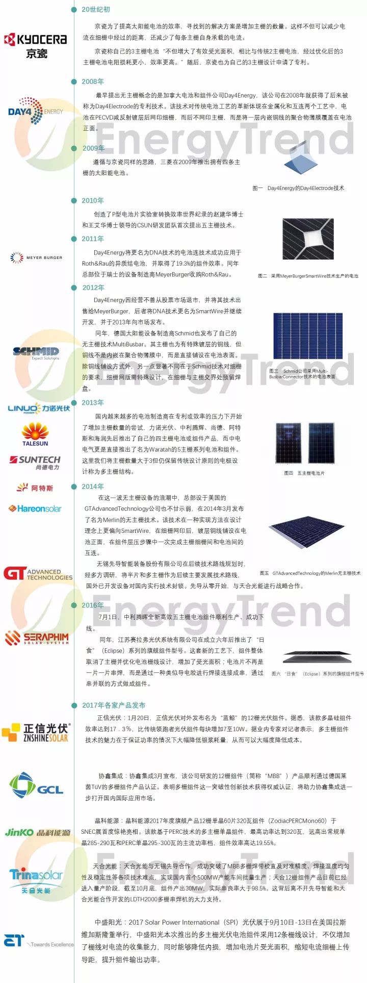 自2009年業(yè)內(nèi)逐漸導(dǎo)入三主柵開始,就一直在突破,從三主柵、四主柵和五主柵到如今的十二主柵,如何將產(chǎn)品做的實(shí)惠美觀又高效?各廠家為此挖空心思。根據(jù)網(wǎng)絡(luò)公開信息,小編整理了從20世紀(jì)初開始,國(guó)內(nèi)外太陽能電池片主柵技術(shù)的發(fā)展歷程,并盤點(diǎn)了2017年國(guó)內(nèi)各大廠家的相關(guān)產(chǎn)品發(fā)布情況。(如有疏漏,歡迎補(bǔ)充。)