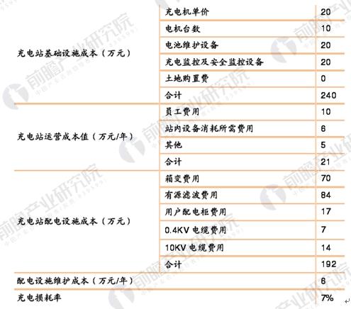 充電站成本分為三大部分:基礎(chǔ)設(shè)施成本、配電設(shè)施成本、運(yùn)營成本。目前很多充電站均是由省網(wǎng)公司和當(dāng)?shù)卣?lián)合建設(shè),很多用地均為政府劃撥,土地購臵費(fèi)較低,在對(duì)充電站基礎(chǔ)設(shè)施成本的判斷中,假設(shè)土地購置費(fèi)用為0。