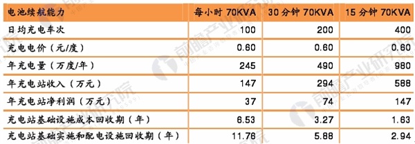 總體來看,單個(gè)充電站基礎(chǔ)設(shè)施和配電設(shè)施投資額不算大,如果電池續(xù)航能力能夠達(dá)到半小時(shí)70KVA以上,充電站成本回收期能控制在6年以內(nèi),單個(gè)充電站基礎(chǔ)設(shè)施和配電設(shè)施投資在430萬元左右。