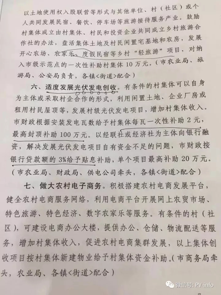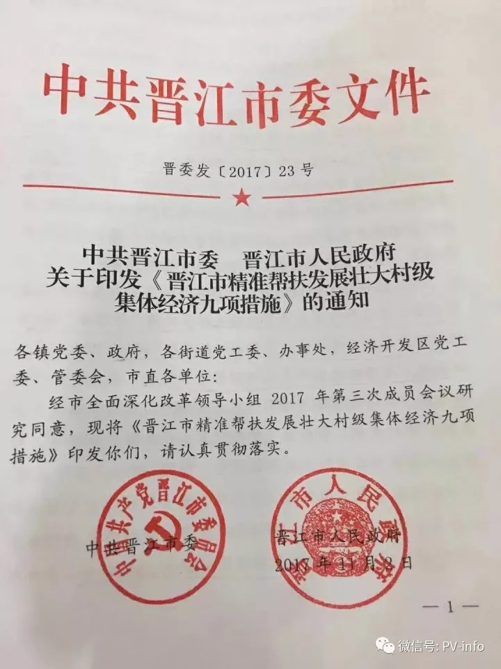中國儲能網(wǎng)訊:2017年11月2日晉江市委市政府聯(lián)合發(fā)布《晉江市精準(zhǔn)幫扶發(fā)展壯大村級集體經(jīng)濟(jì)九項(xiàng)措施》的文件,對晉江市光伏發(fā)電實(shí)行補(bǔ)助,村級光伏項(xiàng)目一次性補(bǔ)助2元/瓦,對于貸款部分,市級財(cái)政給予3%的貼息補(bǔ)助,相當(dāng)?shù)耐梁溃档梦覀兤渌畬W(xué)習(xí)!