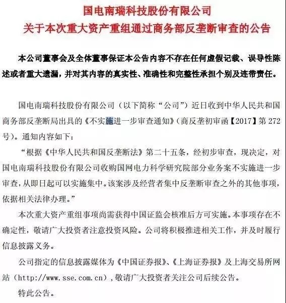 “根據(jù)《中華人民共和國(guó)反壟斷法》第二十五條,經(jīng)初步審查,現(xiàn)決定,對(duì)國(guó)電南瑞科技股份有限公司收購(gòu)國(guó)網(wǎng)電力科學(xué)研究院部分業(yè)務(wù)案不實(shí)施進(jìn)一步審查,從即日起可以實(shí)施集中。該案涉及經(jīng)營(yíng)者集中反壟斷審查之外的其他事項(xiàng),依據(jù)相關(guān)法律辦理?!?