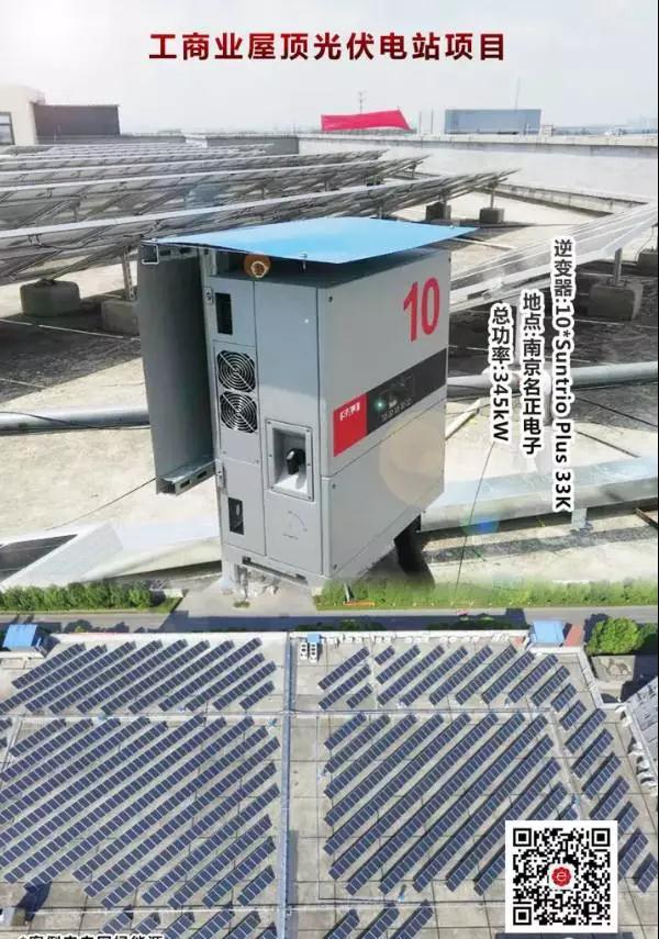 這是南京名正電子有限公司屋頂上的345kW光伏電站,采用自發(fā)自用余電上網(wǎng)的并網(wǎng)模式,這個(gè)工商業(yè)屋頂電站的案例可能跟大家之前看過(guò)的工商業(yè)屋頂電站不同,因?yàn)樗陌惭b方式比較特別,因?yàn)樗墓夥M件安裝方向是對(duì)角線的走向。為什么這么安裝呢?相信光伏人都已經(jīng)猜到了,那就是最佳安裝角度安裝。