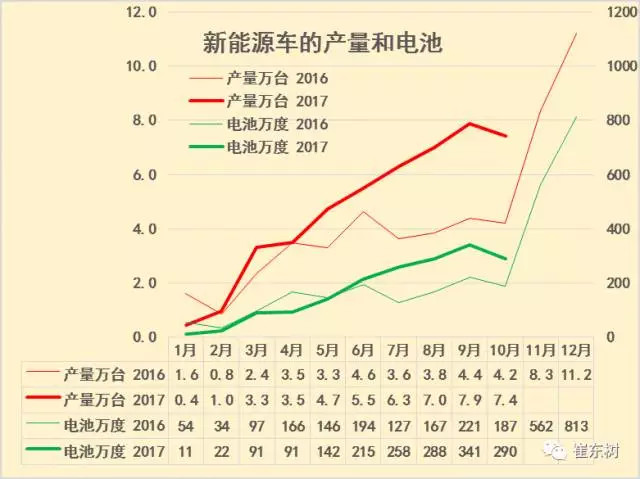 根據崔東樹個人測算,按照汽車生產合格證數(shù)據:2017年10月新能源汽車產量7.4萬臺,增長76%;電池裝機總電量約290萬度,同比增長55%。由于10月生產時間短,10月新能源汽車產量環(huán)比9月下降6%,鋰電池裝車量環(huán)比9月下降15%。從1-9月的汽車走勢看,電池需求和整車數(shù)量都是是逐步增長狀態(tài),尤其是在常規(guī)車型持續(xù)低迷的背景下,新能源車持續(xù)環(huán)比增長是令人振奮的。而10月的環(huán)比下降主要是工作日時間等影響,并非產銷的動力不強的問題。