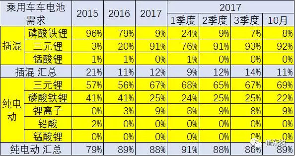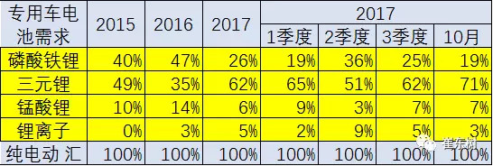 專用車的三元化趨勢很明顯。1-10月的三元電池的裝車量達到62%的占比,而16年的占比是35%.10月達到71%,三元提升的趨勢相對是合理的狀態(tài)。