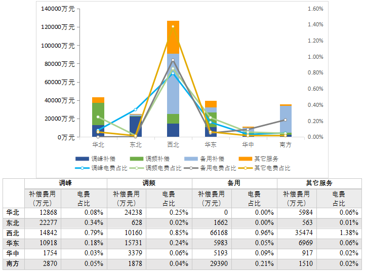 華中和南方區(qū)域由于兩區(qū)域內(nèi)水電裝機(jī)容量占比較高,備用補(bǔ)償費(fèi)用在本區(qū)域各項(xiàng)費(fèi)用中為最高。