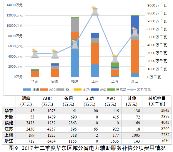 華東區(qū)域由于江浙滬地區(qū)以火電為主的電源結(jié)構(gòu)在消納區(qū)外來(lái)電和可再生能源時(shí)面臨的調(diào)峰壓力,本地備用容量也存在部分富余,電力輔助服務(wù)補(bǔ)償費(fèi)用以調(diào)峰、AGC補(bǔ)償為主,但備用補(bǔ)償占比也較為明顯。