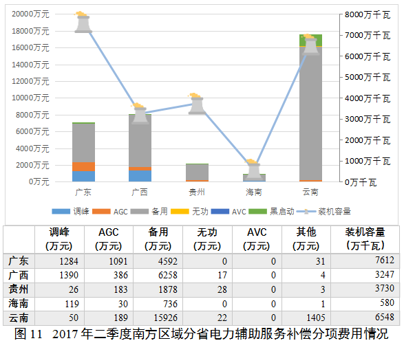 南方區(qū)域除廣東、廣西以AVC補(bǔ)償為主外,其他省份尤其是云南省,由于水電裝機(jī)規(guī)模較大,以備用補(bǔ)償為主??傮w來(lái)看,南方區(qū)域裝機(jī)容量與補(bǔ)償費(fèi)用的總體趨勢(shì)相近,補(bǔ)償力度在各?。▍^(qū))基本一致(見(jiàn)圖11)。