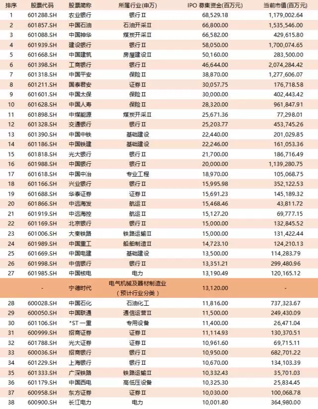 表3:A股IPO募資超過100億元的排名