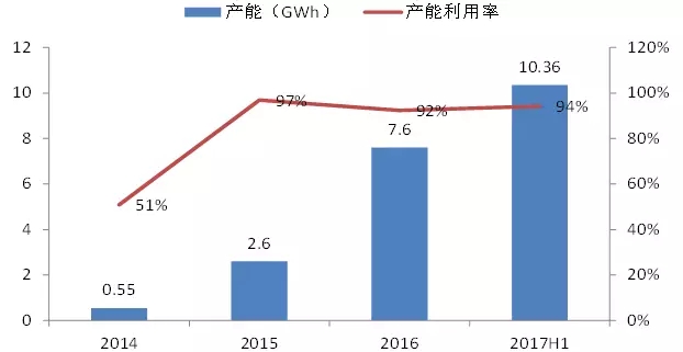 伴隨旺盛的行業(yè)需求,公司產(chǎn)能也隨之大幅增長,2017年H1時達到10.36GWh(年化數(shù)據(jù)),而產(chǎn)能利用率一直維持在90%以上,顯示公司的產(chǎn)品市場接受度極高。
