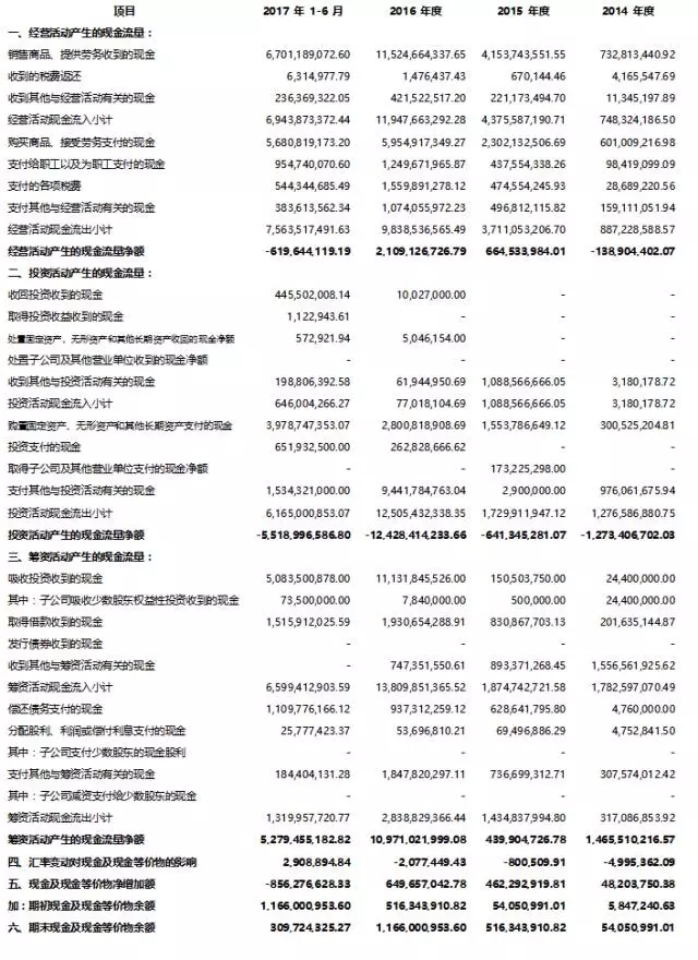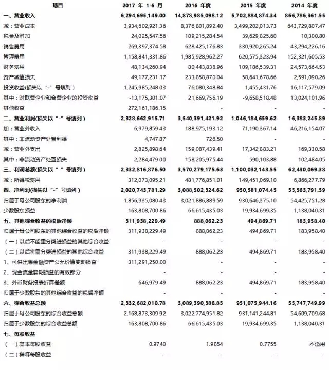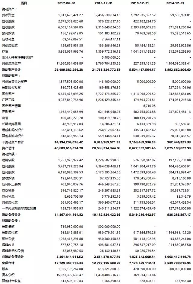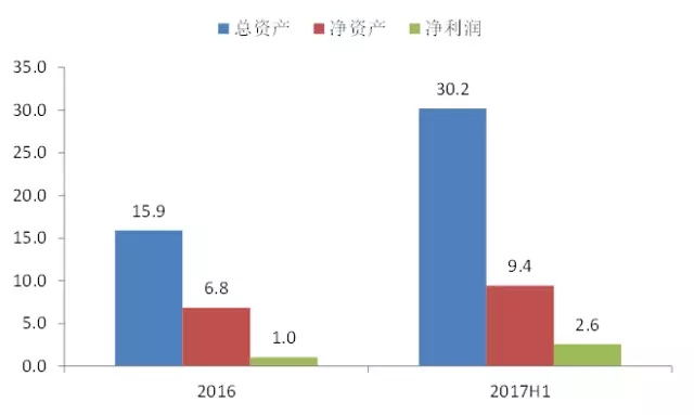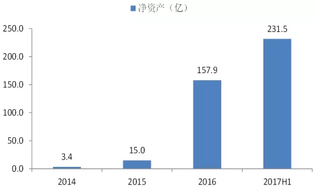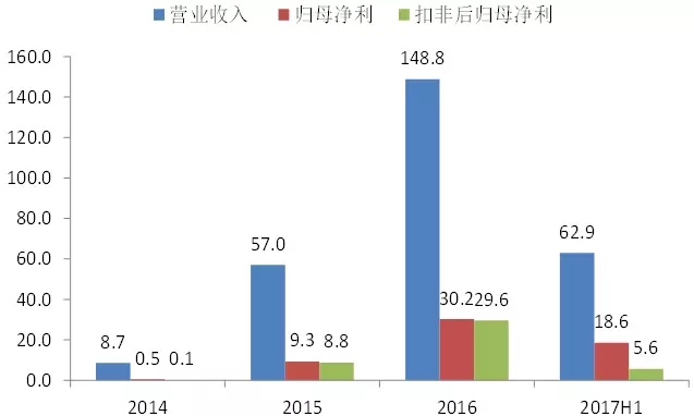 公司自2014年以來維持驚人增速,2016年和2017年1-6月份的營收分別為148.8億和62.9億,凈利潤分別為30.2億和18.6億(2017H1扣非后凈利為5.6億)。公司2014年底凈資產(chǎn)為3.4億,2017年H1末為231.5億元,對比增長了68倍。
