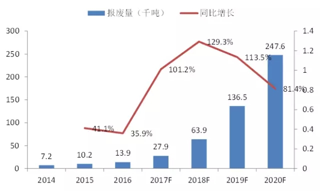 2015年動力電池進入爆發(fā)期,而這一部分電池在2018年開始進入退役期,隨著動力電池報廢規(guī)模逐步增長、動力電池回收規(guī)則明確、回收渠道規(guī)范、動力電池拆解回收技術(shù)進步,鋰電池梯次利用和報廢回收的規(guī)模將逐年擴大,根據(jù)高工鋰電預(yù)測數(shù)據(jù),2020年國內(nèi)鋰電池報廢數(shù)量有望達到24.76萬噸,對比2016年增長17.8倍,行業(yè)未來幾年將呈現(xiàn)爆發(fā)式增長。
