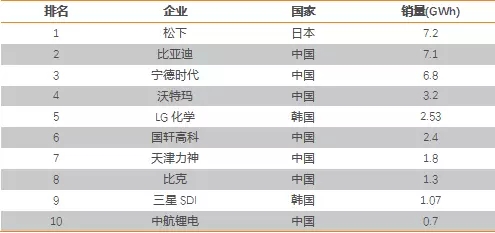 表6:2016年全球動力電池企業(yè)銷量排行榜