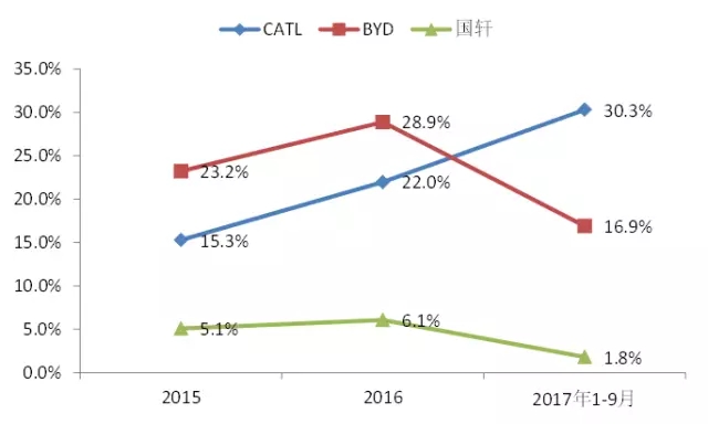根據(jù)中國市場調(diào)查網(wǎng)統(tǒng)計數(shù)據(jù),公司在2016年電池銷售量6.8GWh排名全球第三。而根據(jù)真鋰研究的最新數(shù)據(jù),2017年前三季度公司累計電池裝機總量已經(jīng)全面超越比亞迪、國內(nèi)市占率達到30%,優(yōu)勢穩(wěn)固。