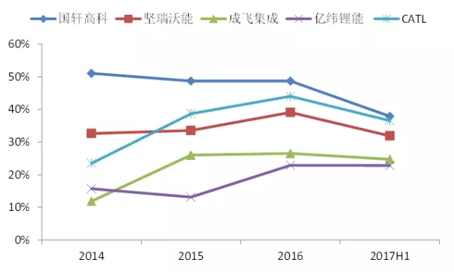公司動力電池系統(tǒng)單價呈現(xiàn)快速下降趨勢,2015-2017H1的下降幅度分別達到21.1%、9.6%和26.2%??梢钥吹?017年由于補貼標準調(diào)整,動力電池價格下降幅度最為明顯,但其中也有部分原因是2016年動力電池價格下降幅度較少。在價格大幅下降的情況下,公司毛利率依然維持在37.1%的較好水平。