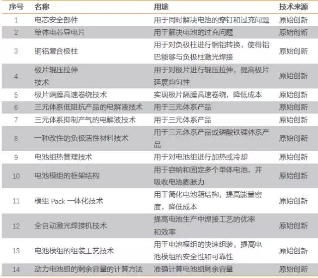 截至2017年9月30日,公司及其子公司共擁有813項境內(nèi)專利及13項境外專利,涵蓋了材料、電芯設(shè)計、電池組、電池包、儲能系統(tǒng)等領(lǐng)域。其中核心技術(shù)及技術(shù)來源如下: