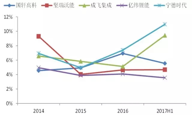 (2)研發(fā)費用占比:寧德時代在研發(fā)投入方面持續(xù)發(fā)力,整體研發(fā)投入占比高、2017年H1已經(jīng)突破10%,處于同行較高水平,研發(fā)費用占主營業(yè)務(wù)的比例隨著整體體量的增大反而不斷提升。