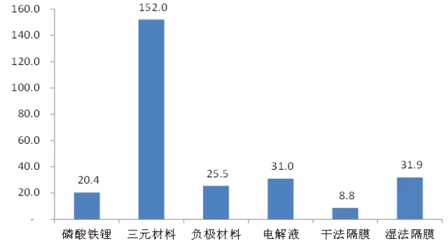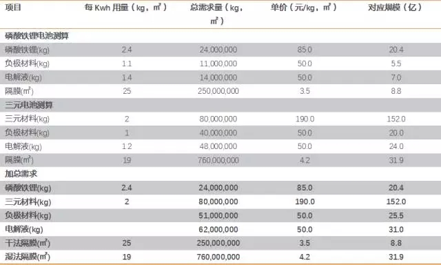 根據(jù)寧德時代17年上半年的產(chǎn)能,以及募投產(chǎn)能建設(shè)規(guī)劃,我們預(yù)計公司2020年產(chǎn)能將超過50Gwh,如果算上與上汽的合資公司時代上汽,則實際產(chǎn)能有可能遠超這個數(shù)字。我們假設(shè)公司2020年出貨量為50GWh(其中磷酸鐵鋰電池10GWh,三元電池40GWh),在國內(nèi)動力電池市占率有望達到45%左右,則可據(jù)此測算出其對原材料的需求量。