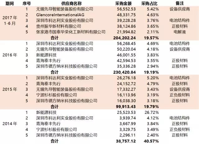 表10:2014年~2017年1~6月寧德時代前五大供應(yīng)商(單位:萬元)