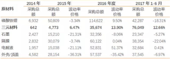 ?公司正極材料為磷酸鐵鋰和三元材料。報告期內(nèi),磷酸鐵鋰平均采購價格呈波動變化;三元材料價格平均采購價格逐年升高,主要原因為碳酸鋰價格的上漲,以及 2016 年至 2017 年間鈷金屬價格的上漲。