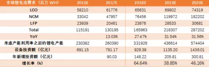 正極、結(jié)構(gòu)件、設(shè)備最為受益寧德時代上市:參照招股說明書,設(shè)備類、正極材料和結(jié)構(gòu)件的單一公司采購金額較大。假設(shè)2020年寧德時代出貨量為50GWh(其中磷酸鐵鋰電池10GWh,三元電池40GWh),其對于三元正極材料需求有可能超過150億,結(jié)構(gòu)件的需求約為50億,而電解液、濕法隔膜的需求約為30億,磷酸鐵鋰需求約為20億。受益企業(yè)包含杉杉股份、長園集團、璞泰來、天賜材料、江蘇國泰等。而如果根據(jù)CATL已有產(chǎn)能規(guī)劃,公司到2020年總產(chǎn)能有望達到80GWH,也即意味著將拉動約1/4的設(shè)備投資需求,2017-2020年投資總規(guī)模約達到180億,期間CAGR達到50%。根據(jù)招股說明書的披露,前段、中段、后段設(shè)備投資占比約為5:3:2,前段與中段價值量大、技術(shù)壁壘高,更有可能誕生設(shè)備龍頭。