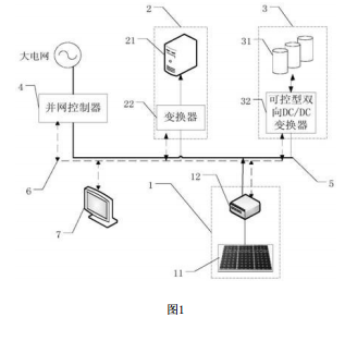 其中:1—電源模塊、2—負荷模塊、3—儲能模塊、4—并網(wǎng)控制器、5—智能直流微電網(wǎng)連接功率電路、6—智能直流微電網(wǎng)通信總線、7—監(jiān)控模塊、11—光伏電池、12—最大功率跟蹤器、21—負荷、22—變換器、31—鋰離子蓄電池組、32—可控型雙向DC/DC變換器
