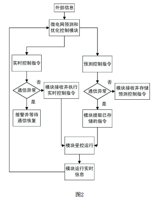 步驟三:檢測智能直流微電網(wǎng)系統(tǒng)通信狀態(tài)。智能直流微電網(wǎng)系統(tǒng)通信正??捎脮r,電源模塊、負荷模塊和儲能模塊接受并執(zhí)行實時控制指令,同時接收并存儲預(yù)測控制指令;智能直流微電網(wǎng)系統(tǒng)通信異常時,電源模塊、負荷模塊和儲能模塊提取已儲存的預(yù)測控制指令,并按照預(yù)測控制指令運行,同時報警并等待通信恢復(fù)。智能直流微電網(wǎng)系統(tǒng)通信異常使用已儲存的預(yù)測控制指令能夠提高智能直流微電網(wǎng)系統(tǒng)的可靠性。