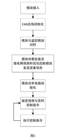 所述智能直流微電網(wǎng)系統(tǒng)易于擴展,可實現(xiàn)即插即用(Plug-and-Play)。擴展模塊可以是電源模塊1、負荷模塊2或者儲能模塊3。新接入的模塊的功率電路接入智能直流微電網(wǎng)連接功率電路5,CAN通信模塊接入微電網(wǎng)通信總線6,接入完成后CAN通信模塊首先完成初始化,包括配置CAN總線通訊節(jié)點模塊的地址,特征碼信息。CAN總線初始化完成后,新接入的模塊與監(jiān)控模塊7完成時鐘校對,保持時間一致。新接入的模塊向智能直流微電網(wǎng)預(yù)測和優(yōu)化控制模塊發(fā)送設(shè)備信息,加入智能直流微電網(wǎng)預(yù)測和優(yōu)化控制模塊算法的元素集合。新接入的模塊進行功率電路初始化,完成故障繼電器開關(guān)自檢和電容預(yù)充電。下一個控制周期開始,智能直流微電網(wǎng)預(yù)測和優(yōu)化控制模塊即可將該擴展模塊加入預(yù)測和優(yōu)化控制計算,并向該擴展模塊發(fā)送實時控制指令和預(yù)測控制指令。此后,新加入的模塊開始正常地運行。