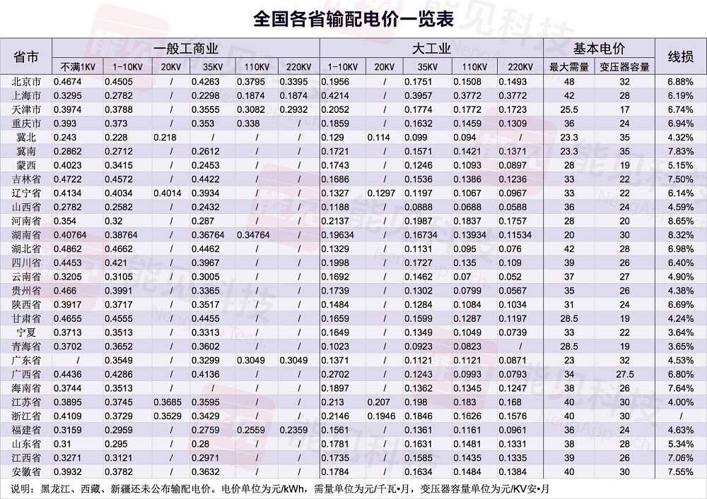 附全國各省輸配電價(jià)一覽表: