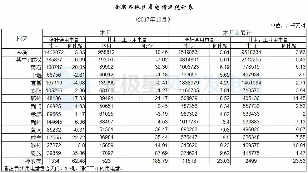 (五)各地區(qū)全社會和工業(yè)用電情況分化,個別地市受去產(chǎn)能因素影響全社會和工業(yè)用電出現(xiàn)較大降幅。10月份全省14個用電統(tǒng)計地區(qū)中,武漢、黃石、荊州等7個地區(qū)全社會用電不同程度增長,其中黃石、咸寧、恩施和神農(nóng)架4個地區(qū)全社會用電增幅在兩位數(shù)以上;從工業(yè)用電情況看,黃石、荊州、黃岡等7個地區(qū)用電增長,其中黃石、黃岡、咸寧、恩施等5個地區(qū)工業(yè)用電增幅在30%以上。鄂州市受其主導(dǎo)產(chǎn)業(yè)鋼鐵去產(chǎn)能因素影響,全社會和工業(yè)用電持續(xù)下降,該市本月全社會和工業(yè)用電降幅仍為兩位數(shù)。