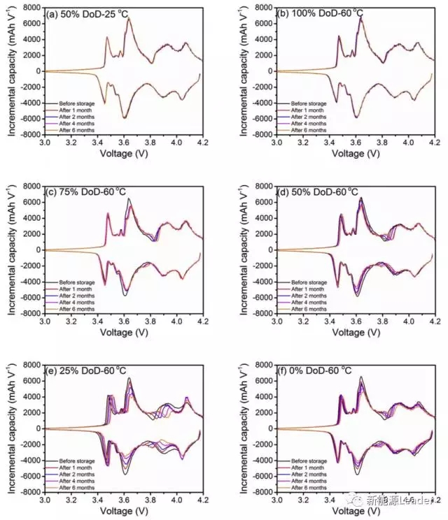 為了分析鋰離子電池在高SoC和高溫下的衰降機(jī)理,Po-Han Lee對(duì)不同的SoC狀態(tài)存儲(chǔ)的電池進(jìn)行了ICP(容量增量法)分析,結(jié)果如下圖所示。ICP曲線中的每個(gè)峰都代表一個(gè)反應(yīng),從圖中可以看到25℃下50%DOD存儲(chǔ)和60℃下100%DOD存儲(chǔ)的電池在經(jīng)過(guò)1、2、4和6個(gè)月后ICP曲線沒(méi)有發(fā)生明顯的變化,表明存儲(chǔ)過(guò)程中鋰離子電池內(nèi)部的副反應(yīng)比較少。