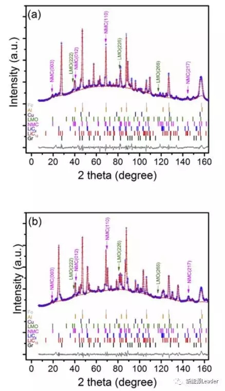 在高分辨率中子衍射技術(shù)的幫助下,Po-Han Lee對(duì)完全充電狀態(tài)和完全放電狀態(tài)下的電池進(jìn)行了原位分析,結(jié)果如下圖所示,可以看到充電狀態(tài)下,LMO晶體的a值,以及NMC晶體的a值和c值都和新電池幾乎一直,但是在完全放電的狀態(tài)下LMO和NMC的a值要小于新電池的值,但是NMC材料的c值卻要高于新電池(活性Li 的損失),LMO材料a值減小主要是因?yàn)樵谳^高的電勢(shì)下儲(chǔ)存導(dǎo)致的Mn2+元素的溶解引起的活性LMO材料損失造成的。