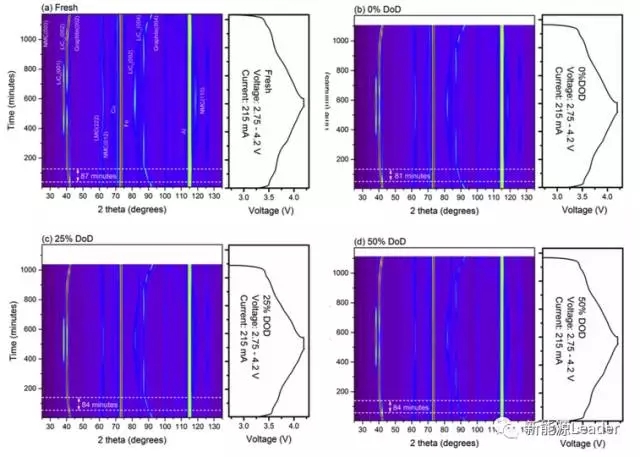 Po-Han Lee采用的中子衍射技術(shù)能夠幫助我們了解上述的三種原因在鋰離子電池存儲(chǔ)容量衰降中所占的比重,幫助我們更好的進(jìn)行針對(duì)性的設(shè)計(jì)。Po-Han Lee研究中所采用的電池正極為iNi0.5Mn0.3Co0.2O2(NMC532)和Li1.1Mn1.9O4(LMO)的混合體系,負(fù)極采用了石墨材料,電池容量為2.2Ah。這些電池被放電至不同的放電深度DOD,然后在60℃下分別存儲(chǔ)1,2,4,6個(gè)月。
