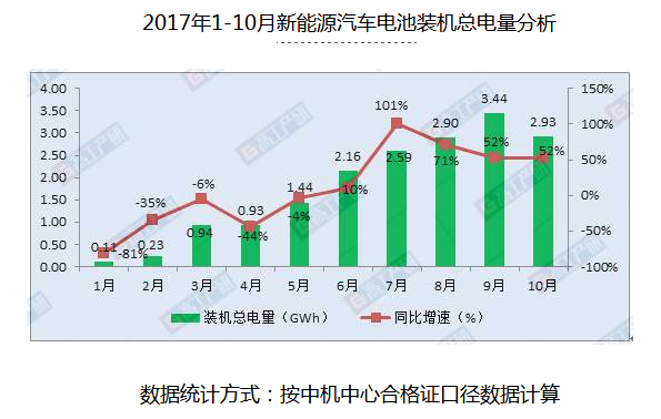 據(jù)GGII統(tǒng)計數(shù)據(jù)顯示,2017年10月動力電池裝機總電量約2.93GWh,同比增長52%,環(huán)比下降15%。