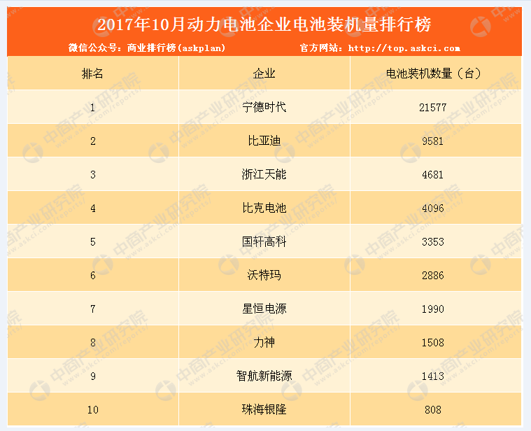 2017年10月動力電池企業(yè)電池裝機量前十排名依次為寧德時代、比亞迪、浙江天能、比克電池、國軒高科、沃特瑪、星恒電源、力神、智航新能源、珠海銀隆。