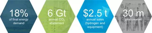 從規(guī)模部署來(lái)說(shuō),截至2050年,氫能可占能源消耗總量的約五分之一。這意味著在目前的水平上減少約60億噸的二氧化碳年排放量,即為實(shí)現(xiàn)將全球變暖控制在兩攝氏度以?xún)?nèi)的目標(biāo)貢獻(xiàn)約20%的減排。