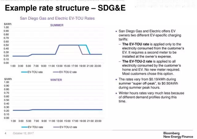 例如美國SDG&E電廠就同時提供以上兩種方案,兩種方案的區(qū)別在于峰谷時間段。據(jù)悉,大多數(shù)家庭會選擇適用于整個家庭的方案,只針對電動汽車充電的方案需要用戶自付費另外安裝電表,且峰時時段更長。