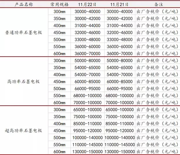 中國儲能網(wǎng)訊:11月22日(周三),中國石墨電極市場價格今日穩(wěn)定。介休市志堯碳素有限公司普通、準(zhǔn)高、超高功率石墨電極價持穩(wěn),企業(yè)銷售穩(wěn)定,庫存低位,產(chǎn)品供不應(yīng)求,下游主供金屬硅、黃磷、鋼廠。年產(chǎn)能6萬噸,10月產(chǎn)量4500噸,普通500噸,準(zhǔn)高2000噸,超高2000噸。河北順天電極有限公司銷售平穩(wěn),庫存低位,下游主供工業(yè)硅、剛玉、黃磷、電石等行業(yè),主要生產(chǎn)大規(guī)格的產(chǎn)品。產(chǎn)品主供云南、四川、新疆等區(qū)域。年產(chǎn)能7萬噸,10月份石墨電極產(chǎn)量2500噸,炭電極產(chǎn)量2500噸。截至2017年11月22日,中國石墨電極直徑300-600mm主流價格:普通功率30000-70000元/噸;高功率50000-100000元/噸;超高功率65000-160000元/噸。(百川資訊)