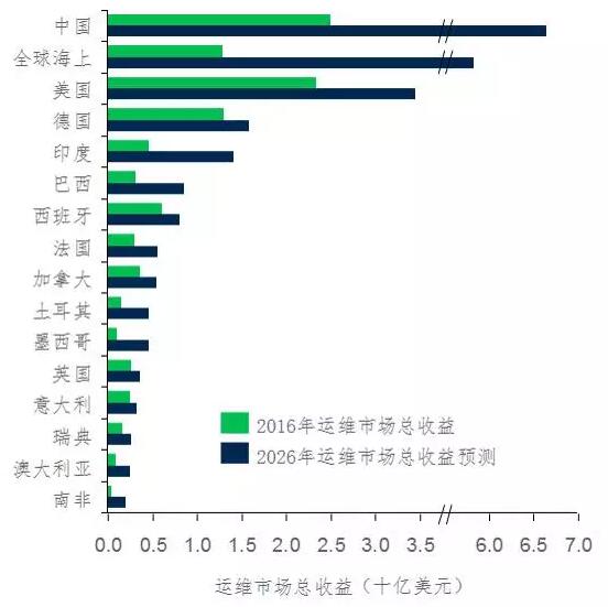 從下圖1可見,歐洲運維市場仍為2016年市場價值最為集中的區(qū)域,風機吊裝歷史悠久、運維成本也相對較高。從下圖2可見,中國市場大量的吊裝項目將促使中國登頂2026年運維市場收益之最,約美元67億。未來十年,美國、德國、印度、巴西與西班牙市場也將憑借大量的吊裝風機體量成為全球最具運維市場機遇與價值的區(qū)域。