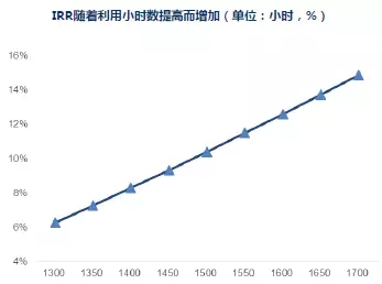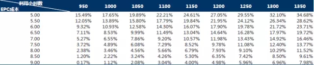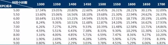 固定利用小時(shí)數(shù),隨著EPC成本提升,內(nèi)部收益率隨之下降。例如,當(dāng)利用小時(shí)數(shù)固定為1600小時(shí)數(shù)時(shí),EPC成本越小,IRR越高。例如,當(dāng)EPC成本為5元/W時(shí),IRR為28.21%,隨著EPC成本增長(zhǎng)至9元/W,IRR下降至5.29%。具體如下圖所示: