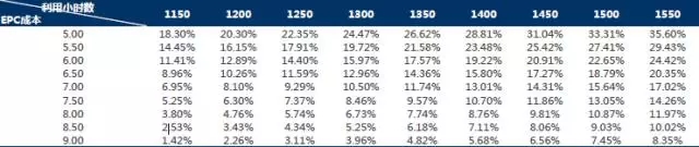 更重要的是,對(duì)于I類優(yōu)質(zhì)地區(qū),資本金IRR對(duì)EPC成本的敏感性大于對(duì)利用小時(shí)數(shù)的敏感性。應(yīng)加快降低EPC成本。當(dāng)EPC成本固定,利用小時(shí)數(shù)平均每提升50小時(shí),IRR增長(zhǎng)較為穩(wěn)定,約1%。當(dāng)利用小時(shí)數(shù)固定,EPC成本越小,IRR下降幅度越大,IRR下降幅度遠(yuǎn)大于1%。所以說IRR對(duì)EPC成本的敏感性大于對(duì)利用小時(shí)數(shù)的敏感性。具體如下表所示。