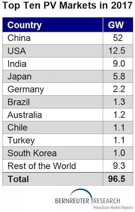 Bernreuter Research估計,考慮到生產(chǎn)和運輸時間滯后以及價值鏈中的庫存,預(yù)計2017年將生產(chǎn)100吉瓦的晶體太陽能電池,再加上5吉瓦的薄膜組件,一共為95到97吉瓦的光伏裝置。Bernreuter解釋說,為避免Suniva和SolarWorld美洲公司在貿(mào)易案例中提出的電池和組件進口關(guān)稅問題,美國將存儲幾個兆瓦的組件容量在2018年安裝。