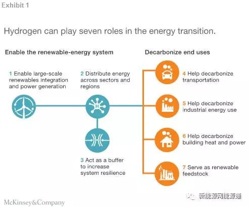 氫能源具有七大作用,其應(yīng)用可以遍及能源系統(tǒng)的主干至終端的低碳應(yīng)用(見表1):