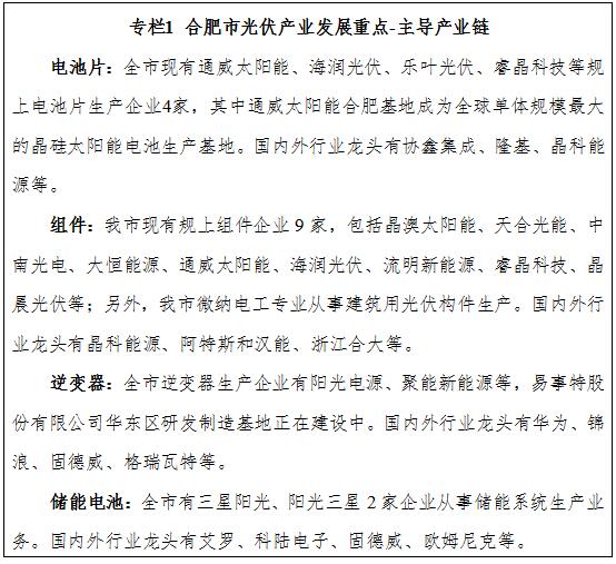 通過采取鞏固一批、拓展一批、培育一批、引進(jìn)一批等措施,持續(xù)推進(jìn)光伏重點(diǎn)項(xiàng)目建設(shè),繼續(xù)壯大產(chǎn)業(yè)規(guī)模。鞏固一批,支持晶澳太陽能、通威太陽能、陽光電源等龍頭企業(yè)繼續(xù)加大技術(shù)改造和產(chǎn)品研發(fā)力度,繼續(xù)保持國內(nèi)乃至全球領(lǐng)先地位。拓展一批,爭取海潤光伏、三星SDI、樂葉光伏、彩虹新能源、天合光能、中建材新能源等國內(nèi)外重點(diǎn)光伏企業(yè)搶抓新能源產(chǎn)業(yè)發(fā)展機(jī)遇,加大在肥投資力度,擴(kuò)大企業(yè)規(guī)模。培育一批,積極支持中南光電、睿晶科技、大恒能源、晶晨光伏、流明新能源、聚能新能源、微納電工等本地一批中小企業(yè)發(fā)展壯大。引進(jìn)一批,主動吸引國內(nèi)外電池片、組件、逆變器重點(diǎn)企業(yè),特別是光伏輔材、建筑用光伏構(gòu)件、薄膜發(fā)電、光熱發(fā)電產(chǎn)品重點(diǎn)生產(chǎn)企業(yè)和光伏生產(chǎn)設(shè)備制造企業(yè)集聚我市,建設(shè)世界級光伏產(chǎn)業(yè)集群。