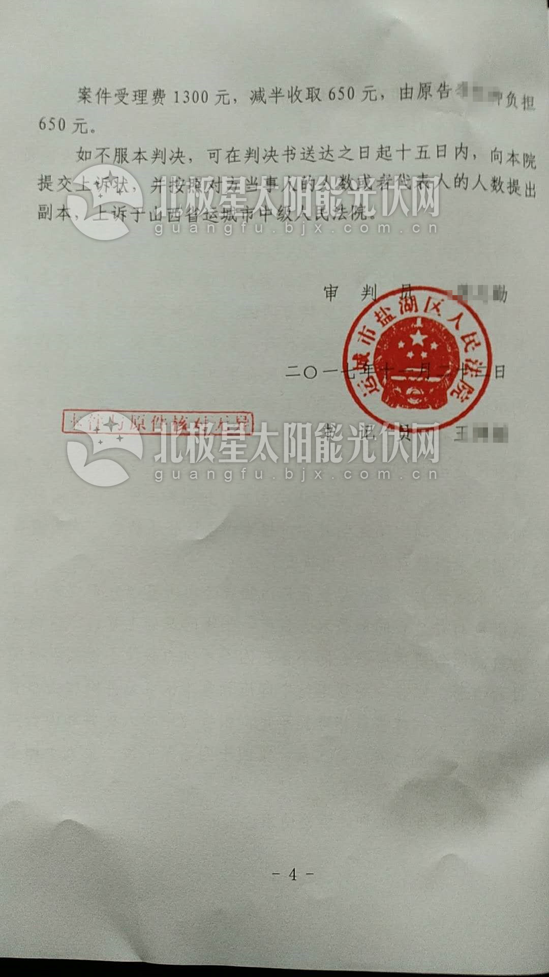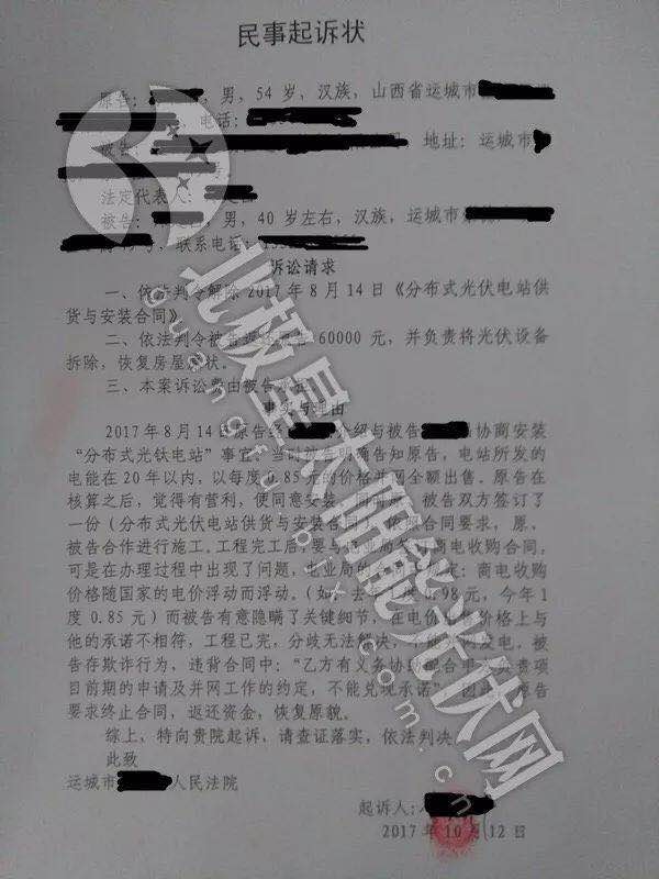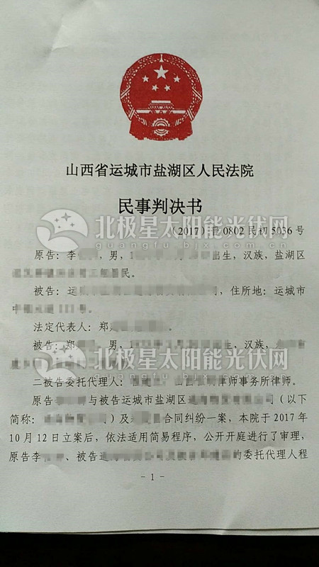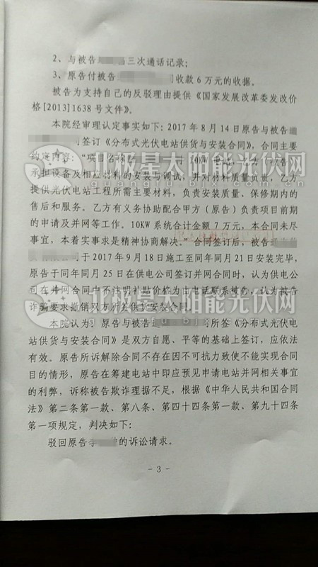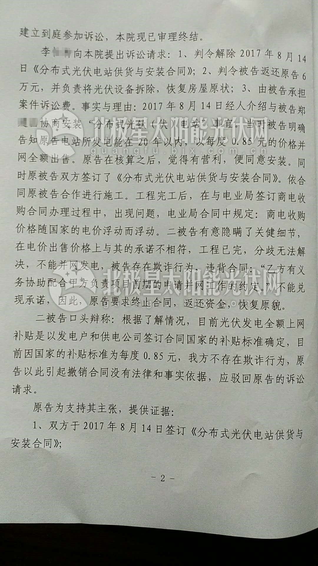 該案件的爭(zhēng)議和核心在于,用戶李某看到與電業(yè)局簽訂的發(fā)用電合同中沒有寫明光伏電價(jià)補(bǔ)貼標(biāo)準(zhǔn)事宜,“聽說0.85元的度電補(bǔ)貼會(huì)隨著國(guó)家政策的調(diào)整而變化,并不能保證20年不變,心生顧慮才反悔。”因此,李某將光伏經(jīng)銷商鄭某以欺詐理由告上了山西運(yùn)城鹽湖區(qū)人民法院。(可參考此前報(bào)道《一紙傳票,山西某光伏經(jīng)銷商被告上法庭!》)