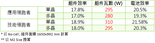 領跑者計劃實際上僅制定組件瓦數(shù)的門坎,因此業(yè)者除了在電池技術上提升外,亦可透過半切、雙面電池等技術來撐高瓦數(shù)表現(xiàn)。