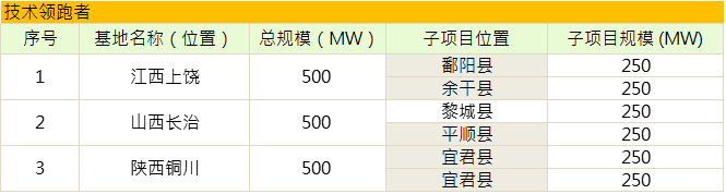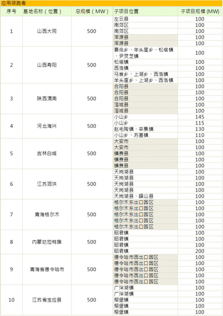 最后評選出來的基地共有13個,包括10個應用領跑者基地(共5GW)和3個技術領跑者基地(共1.5GW),清單如下: