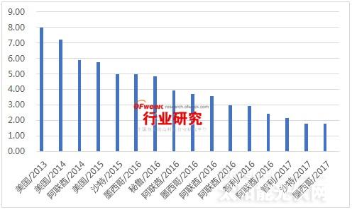 圖表1:歷年光伏最低報(bào)價(jià)記錄統(tǒng)計(jì)(單位:美分/千瓦時(shí))